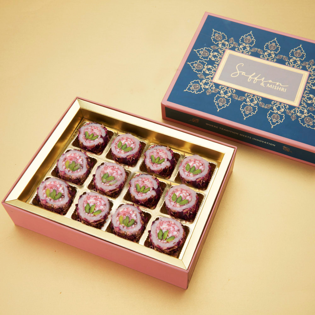 Inspired by the intricate beauty of Banarasi textiles,our boxes echo India’s rich craft traditions, each motif reflecting the same care and detail as the layered, luxurious mithai within.