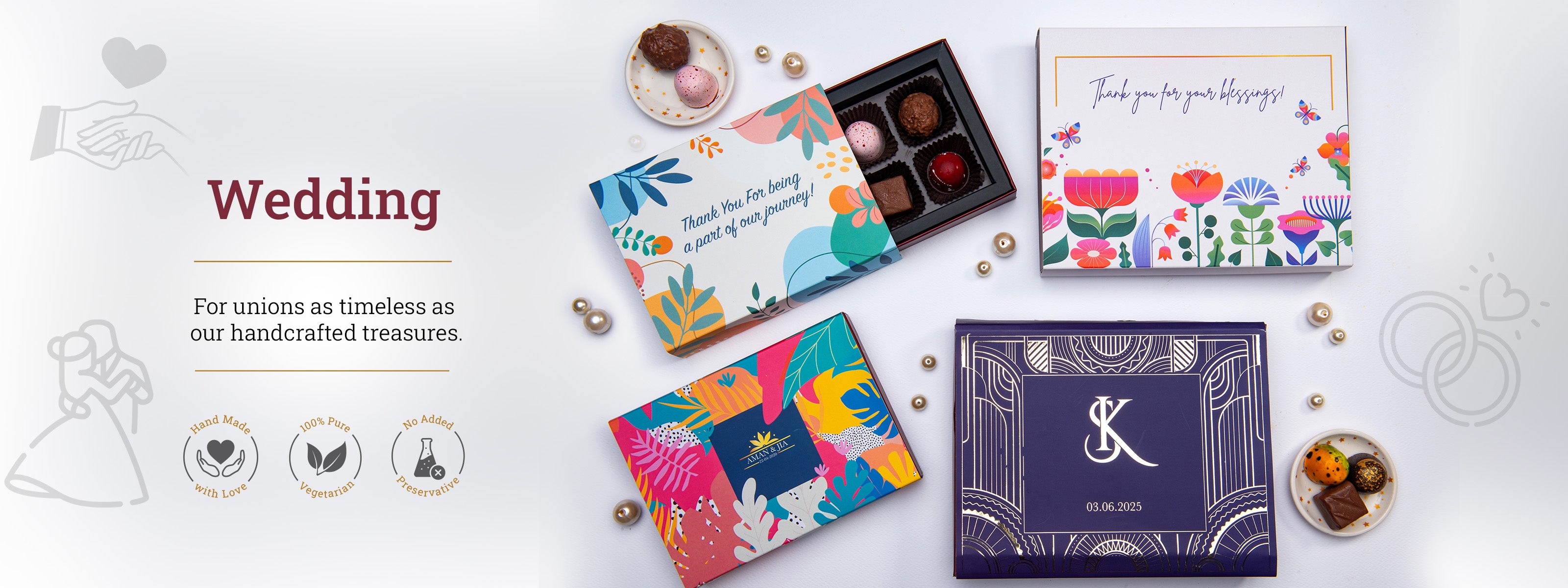 Your wedding story starts with the invite. Elevate that moment with thoughtful mithai and gourmet treats crafted to delight every guest. From elegant keepsake boxes and custom monograms to curated assortments and mindful packaging, each hamper reflects grace, joy, and the promise of a beautiful celebration. Our team helps with curation, personalization, and seamless delivery so your invitations carry sweetness, style, and heart.